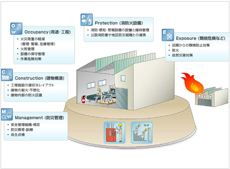 弊社では、リスク状況の確認やリスクコントロールの提案において、Management、Construction、Occupancy、Protection、Exposureの 5つの観点(それぞれの頭文字をとって、MCOPE(エムコープ)と呼んでいます)からリスクコントロールにおける重要な着眼点を整理しています。今回のセミナーは安全管理に携わる従業員の皆様を対象として実施したため、M(防災管理)の観点を中心に、日常業務に役立てられる着眼点をご説明しました。