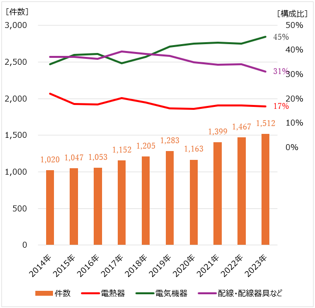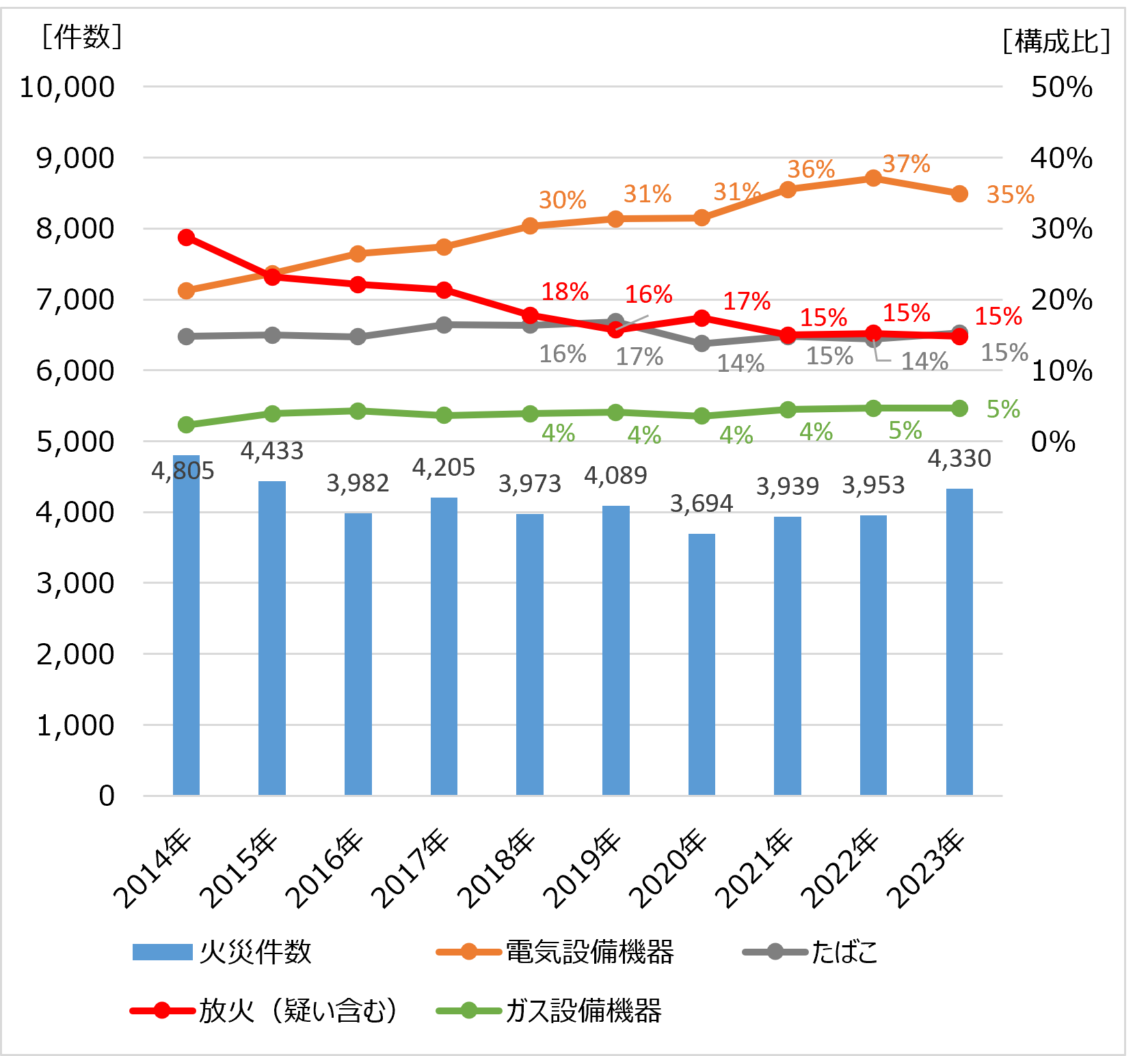 東京消防庁が公表している火災件数データに基づくと、近年火災件数が増加傾向で推移していますが、火災原因の第1位は「電気設備機器」です。2023年は全火災件数4,330件の中で電気設備機器が原因となっている火災は1,512件となっており、約35%を占めています[2]。
