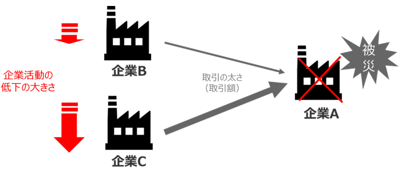 サプライチェーンリスク管理における重要な問題として、企業の取引関係を介した“ショックの波及”(災害等により生じた企業活動の停止が、取引先の事業活動にまで影響を及ぼすこと)があります。そして、このショックの波及の大きさは、企業同士がどの程度の“太さ”(すなわち取引額)でつながっているかに大きく依存します(下図参照)。すなわち、被災企業(企業A)と太い取引をしている企業(企業C)は、そうでない企業(企業B)に比べて、ショックの波及が大きくなる傾向があります。