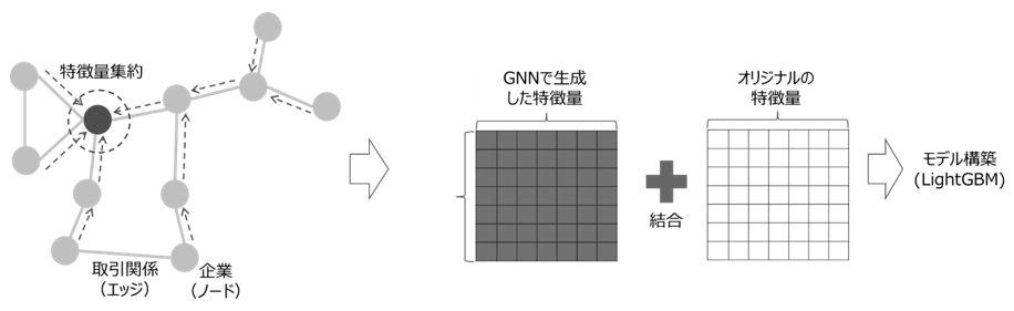 具体的には、グラフニューラルネットワーク(GNN)と呼ばれる深層学習手法と、決定木の発展型であるLightGBMという手法の組み合わせを用いました。GNNの最大の特徴は、対象企業自身の情報だけでなく、周辺の離れた取引先企業の情報までを含んだ特徴量を集約・生成できる点にあります。このGNNを様々なパターンで適用した結果、以下のことがわかりました。