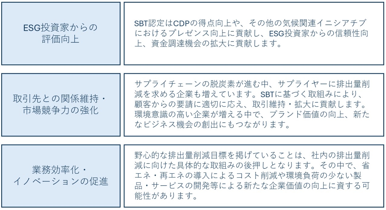 SBT認定を取得し排出量削減に取り組むことで、パリ協定に科学的に整合する取組みを進めている企業であることをステークホルダーに分かりやすくアピールでき、信頼性の向上が望めます。