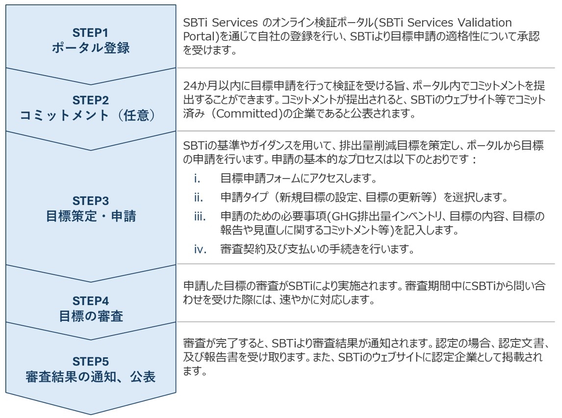 SBTiに目標を申請し、認定を受けるまでの流れは以下のとおりです。企業(中小企業や金融機関以外)が新規で目標を申請する場合、STEP3で審査の契約を開始して以降の審査期間は、約40~60営業日となっています。審査には申請タイプ別に費用がかかります。