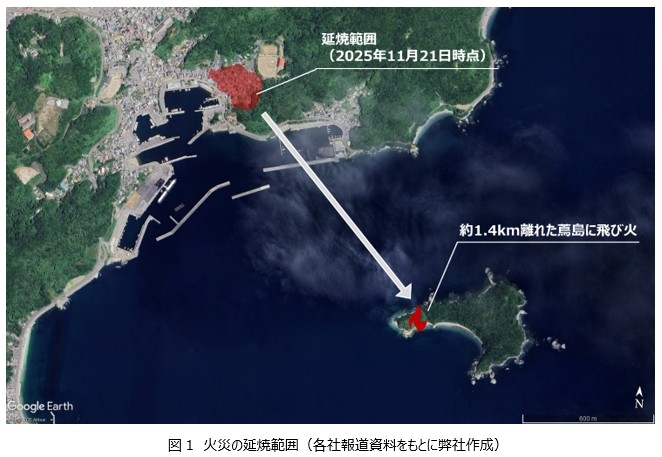 さらに、今回の火災では、火の粉が約1.4km離れた離島まで飛んで延焼する極めて珍しい現象が発生しました。これは日本国内でも稀な事例として注目されています。