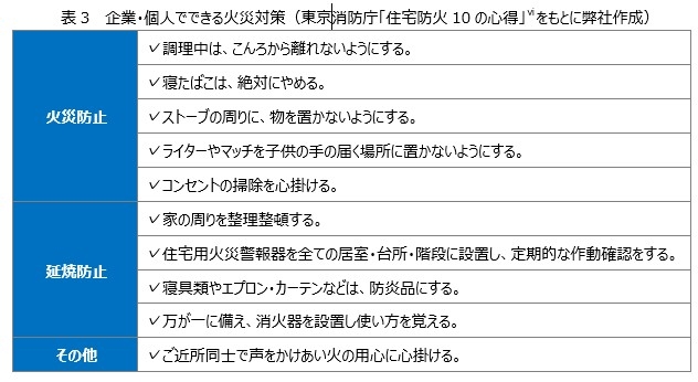 行政の取り組みとしては、改めて防災の観点からのまちづくりの推進が求められます。耐火建築物への建替え支援、空き家・空き地の利活用(空地を計画的に配置したまちづくり)、狭あい道路の解消を中長期の都市計画・まちづくりに組み込む必要があります。 また、離島・山林への飛び火を前提としたより詳細な消防計画の策定や、消火設備と消防水利の整備も重要です。