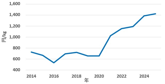 銅価格の推移(公表データ2)より弊社作成。2025年は1~9月までの平均価格)