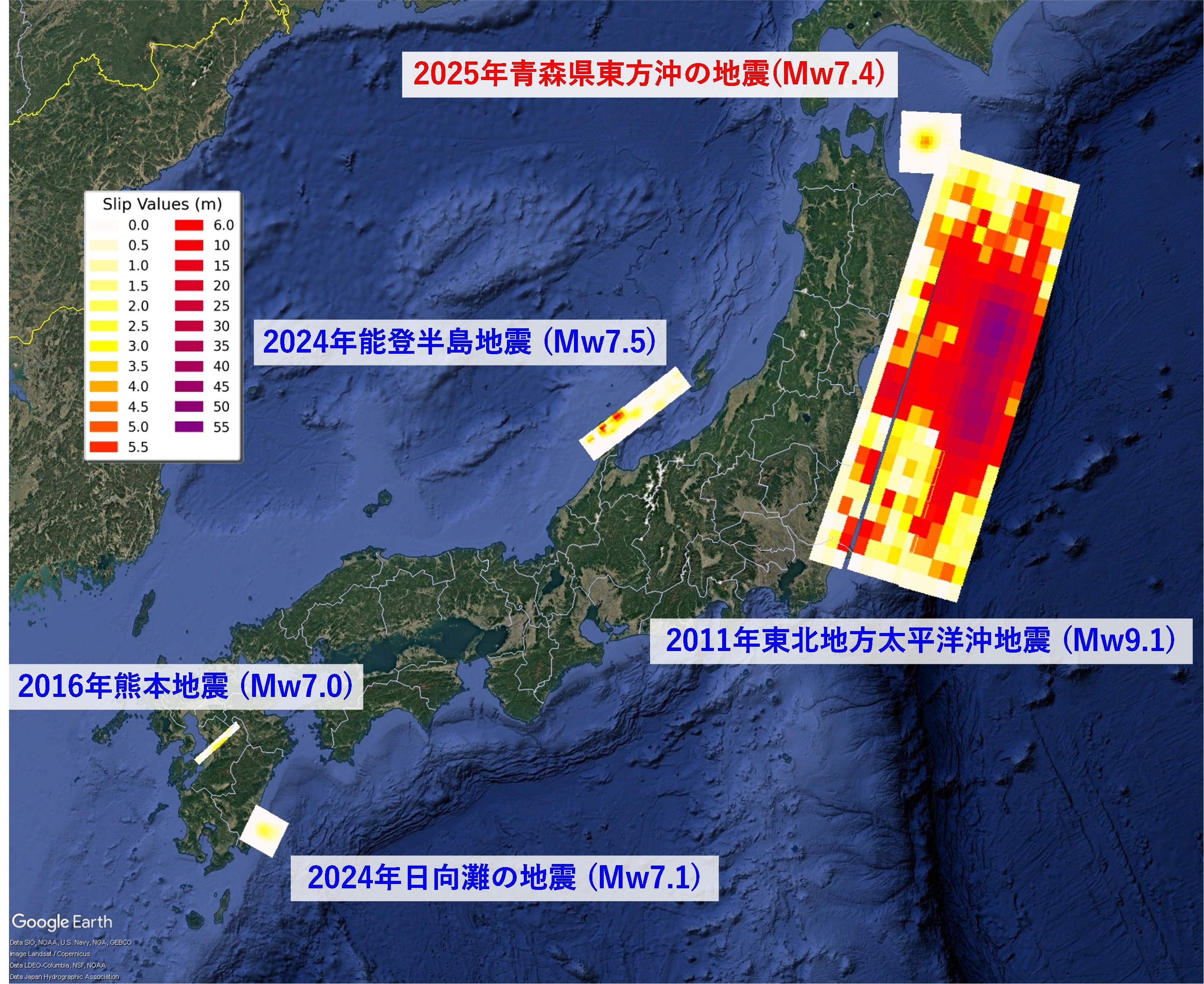 図 4 2025年青森県東方沖の地震と近年日本で発生した地震との有限断層モデルb比較