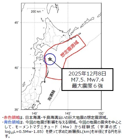 2025年12月8日23時15分頃、青森県東方沖を震源とするマグニチュードMj7.5・Mw7.4(最大震度6強)の大きな地震(以降「2025年青森県東方沖の地震」とします)が発生しました。この地震に関する情報を表 1にまとめます。