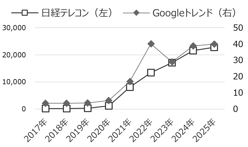 | 図:「経済安全保障」の検索結果・トレンド 出典:筆者作成。日経テレコンは単純検索結果(件数)、Googleトレンドは月あたり指数 |