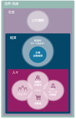 「人々」はその特性により複数の社会的カテゴリーに属し、企業が活動する「社会」や「経済システム」を構成している。この「社会」や「経済」は「自然や気候」に組み込まれており、これらの関係は「人々の状態」と「不平等」に相互に影響を与えている。