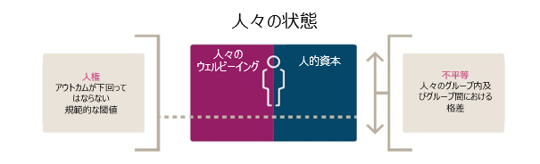 人権、ウェルビーイング、人的資本・社会資本といった社会関連課題の中立的な架け橋となる概念として、「人々の状態(State of People)」という考え方が示されている。この概念において、人権はウェルビーイングの下回ってはならない最低基準(アウトカムの閾値)として設定され、全ての人が尊厳ある生活を送るための基盤となる。企業や金融機関には人権尊重の責任があり、人権が尊重され、人々のウェルビーイングが良好な状態にある社会では、人的資本(優秀な人材の確保)や社会資本(地域社会との信頼性構築)の形成が促進され、企業の持続的な価値創造に寄与する。
