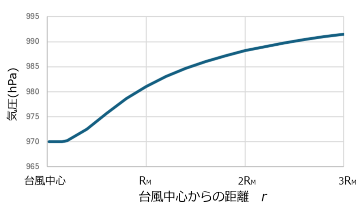 十分に発達した台風では、中心位置から同心円状に気圧が分布する。このことから、研究者は中心気圧と台風のサイズから、中心からの距離と気圧の関係を推定した。図4に台風中心から最も強い風が吹く位置までの距離RMと、台風中心から距離rの場所の気圧の関係一例を示した。このように、台風中心では気圧が低く、離れるに従い徐々に気圧が上昇する特徴的なパターンを描く。