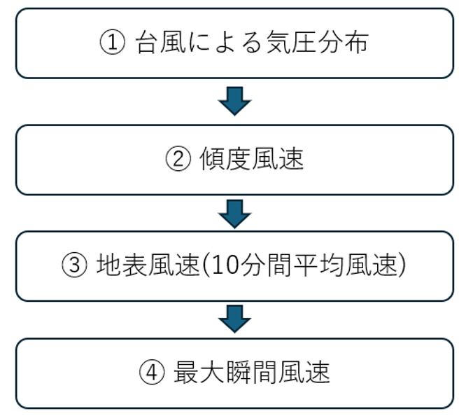 では、どのような台風が来ると、どれくらいの強風が吹くのだろうか。これは物理法則と観測的な知見を組み合わせて推定することができる。図 3に台風による最大瞬間風速算出の概要を示し、以降それぞれの項目について解説する。