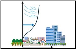 図 6 傾度風が地表面粗度により弱くなり地表風速となる概念図(弊社作成)