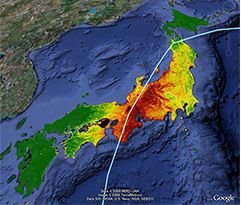 このようにして得られた仮想台風による最大瞬間風速情報が、風災リスクモデルの3要素の一つとして用いられる風災ハザードである。一例として、図 7に伊勢湾台風の経路と強度を想定した仮想台風による風災ハザードのイメージを示した。