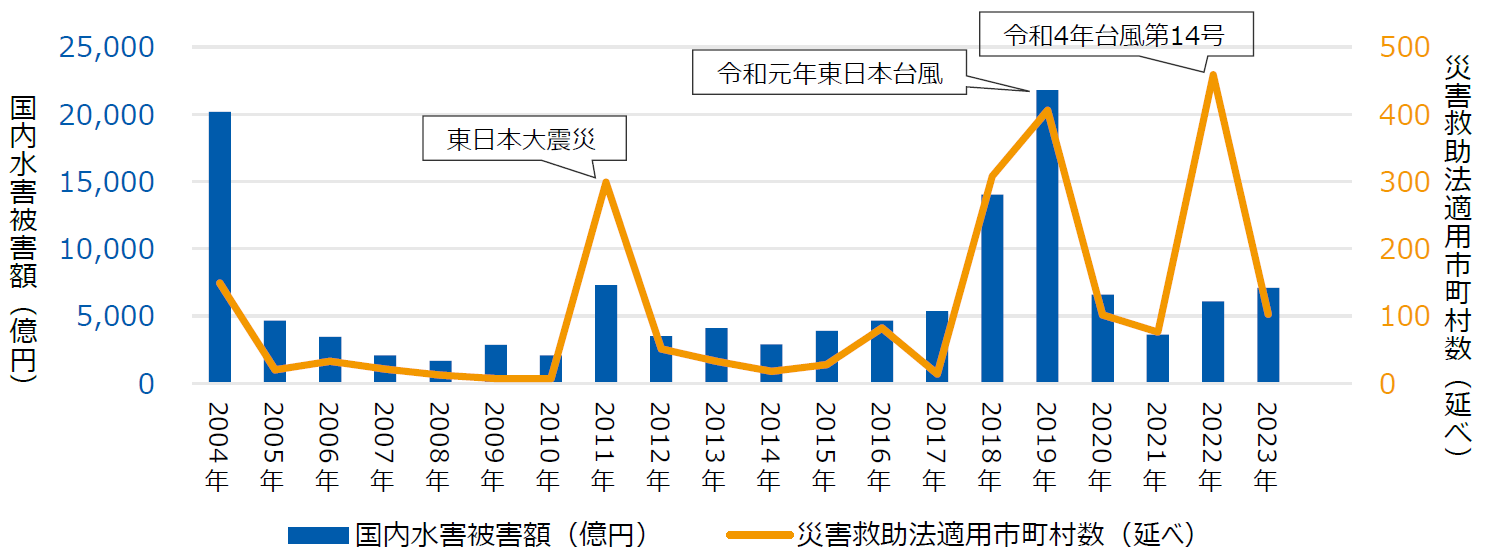 図表1 国内水害被害額と災害救助法が適用された市町村数の推移