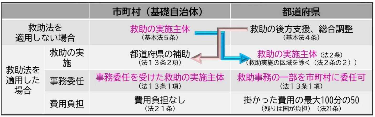 災害救助法が適用されると、救助の実施主体が市町村から都道府県へ移り、市町村は都道府県から事務委任を受けた救助の実施主体となる。救助等に要した費用についても市町村の費用負担はなく、都道府県が最大50%を負担し、残りは国が負担することとなる。